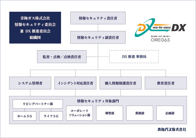そのため、私たちは「情報セキュリティ委員会」をDX推進の中核組織と位置づけ、社長直轄の体制のもと、DX戦略「wa-to-nasu DX」と「情報セキュリティ基本方針」を表裏一体のものとして運用いたします。